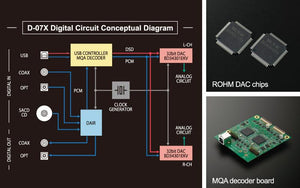Following standards set by the D-10X flagship model, high-end BD34301EKV DAC chips manufactured by Rohm Co., Ltd. in dual monaural configuration lie at the core of the digital circuitry that processes various digital media from discs, such as CDs and SACDs, to the latest high-resolution audio files with exceptional quality. Over a USB input from a PC, Mac, NAS for audio, etc., the D-07X supports a wide range of format encoding up to PCM768kHz/32 bit and DSD22.4MHz. Bulk Pet transfer, which equalizes transmission load, can also be selected by using our dedicated driver software. Furthermore, the popular high-quality format MQA (MQA-CD/MQA file), expands the field of optical discs, streaming USB, COAX, and optical. The clocking system is designed to support accurate digital signal processing and is equipped with two high-precision, low-jitter, ultra-low phase noise modules that reduce noise near the oscillation frequency to a minimum. There is also a built-in, 2-mode analog FIR filter that allows you to select your preferred sound quality when playing SACD or DSD files.