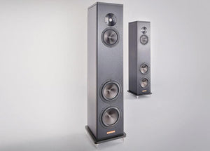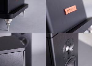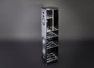 The A3 enclosure is formed with machined 6061 T6 aircraft grade aluminum and includes a complex internal bracing structure that increases the stiffness and mass of the enclosure while minimizing overall resonance. A calibrated sub-enclosure provides an optimized environment for the midrange driver to operate within and without any interaction from the back wave pressure of the bass drivers. The black brushed aluminum enclosure is lustrous and stands firmly on a 4-point spiked outrigger base which provides perfect coupling to the floor for enhanced dynamic range.